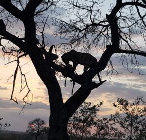 In some countries leopards are sometimes hunted with dogs. However, in South Africa the preferred method is either to locate a fresh leopard kill and hope to shoot the leopard over its own kill, or for the client to shoot bait animals to be hung in an attempt to attract a hungry leopard. Leopard are very suspicious and cautious. A leopard will have more “confidence” in returning to its own kill than in coming to a bait that has been killed by a hunter and then hung. However, plenty of leopard are harvested from hung bait.