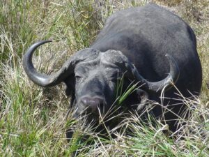 The Cape Buffalo is one of the most successful grazers in Africa. Herds of buffalo mow down stiff grasses thus making way for more selective grazers such as several species of antelope. The buffalo occupies a wide range of habitat; from swamps and floodplains to savannah grasslands, mopane forests, and dense mountainous terrain. It prefers dense cover such as reeds and thickets. Getting into this type of cover with a buffalo herd and sorting out the single animal to shoot can be quite the challenge. Having a big herd storm off in a cloud of black bodies and dust mere yards in front of you can be quite the adrenaline rush.